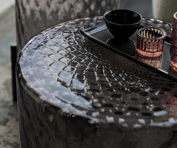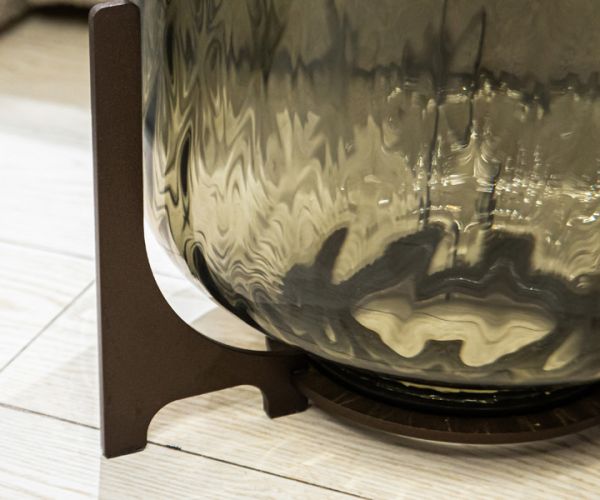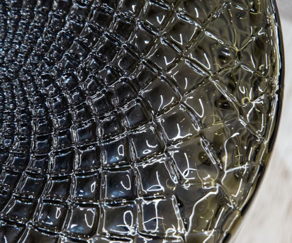 Корпус стеклянного журнального столика Dodo украшен трехмерным узором из перекрещивающихся ромбов, полученным с помощью металлической формы. В результате выдувания ребра внутри формы придают расплавленному стеклу объем и создают характерный граненый эффект, характерный для процесса баллотон. В верхней части создается узор в виде мандалы, слегка смещенный от центра в месте соединения ромбов формы, что создает узор, напоминающий лепестки цветов или идеальные узоры буддийской традиции, с помощью которых природа выражает свое великолепие. Оптический эффект впечатляет и ещё больше усиливается за счёт фиолетовых оттенков дымчатого хрусталя. Свет отражается от ровных узоров, создавая мягкий, нежный эффект. Три опоры, образующие ножки, имеют чёткие очертания, которые контрастируют с округлостью дизайнерского стола. Эта деталь также усиливает общее впечатление от ретро-стиля, адаптированного к современности. Этот журнальный столик — воплощение великолепия изделий из стекла ручной работы.