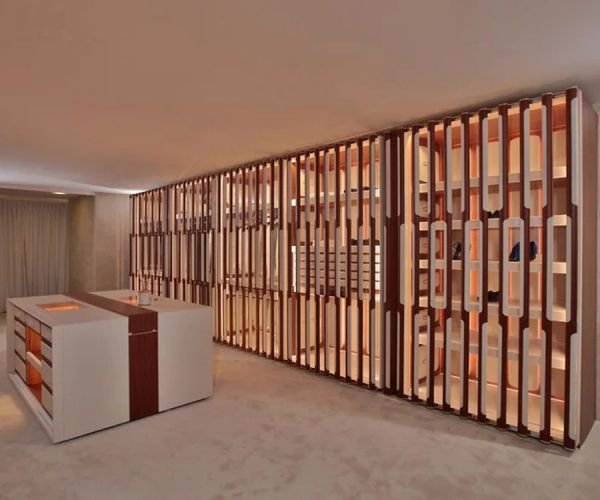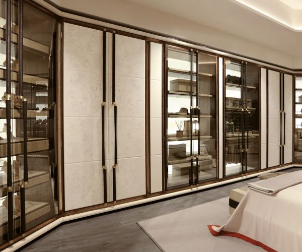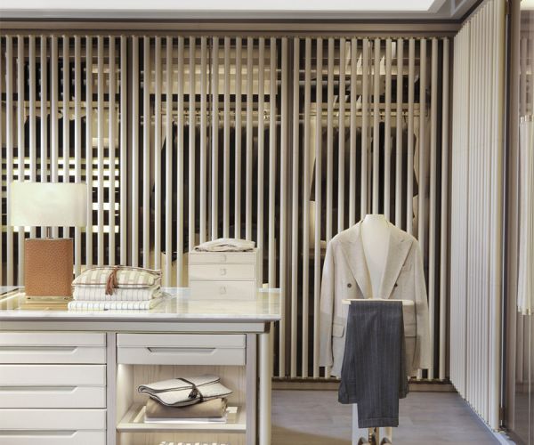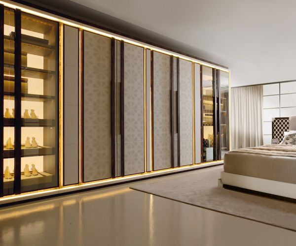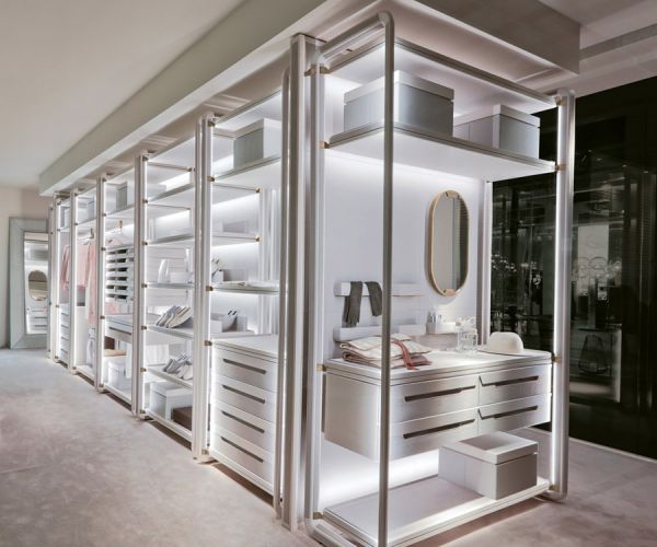 Главная новинка компании - гардеробная Spectre, была представлена на Миланском салоне. Это система хранения с множеством конфигураций полок, ящиков, колонн и отделений для одежды и обуви, которая управляется через приложение, установленное в гаджете. Элементы гардеробной и острова к ней изготовляются из дерева махагони, выбранного за его прочность и богатую, теплую фактуру, и отделываются натуральной кожей. Латунные детали придают мебели элегантность и утонченность. Предусмотрены секретные отделения для хранения самых ценных предметов: украшений, документов, а также сейфы и виндеры для часов, предназначенные для автоматического подзавода механических моделей. Необычные фасады выполнены из стекла и декорированы планками из массива дерева с кожаными вставками.
