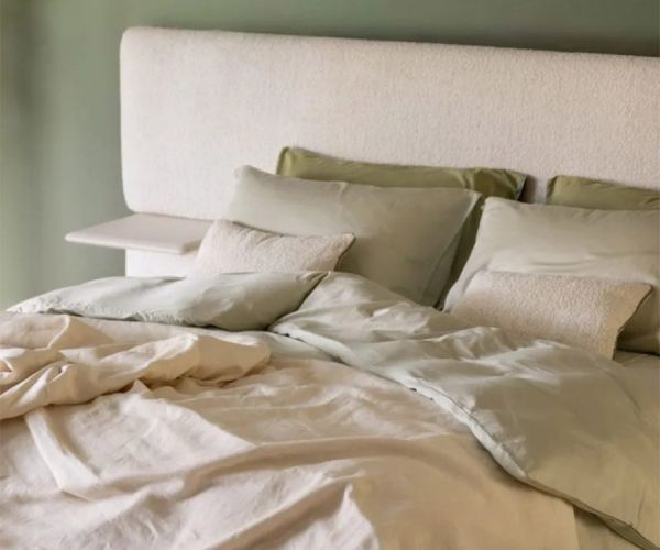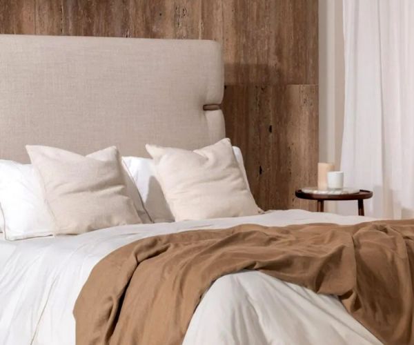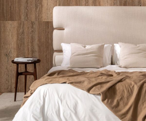 В одной из моделей изголовье из ткани Elite Collection гармонирует со вставками в изголовье кровати из орехового дерева canaletto, создавая изысканный баланс между материалами и деталями.