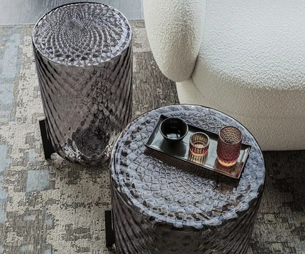 Корпус стеклянного журнального столика Dodo украшен трехмерным узором из перекрещивающихся ромбов, полученным с помощью металлической формы. В результате выдувания ребра внутри формы придают расплавленному стеклу объем и создают характерный граненый эффект, характерный для процесса баллотон. В верхней части создается узор в виде мандалы, слегка смещенный от центра в месте соединения ромбов формы, что создает узор, напоминающий лепестки цветов или идеальные узоры буддийской традиции, с помощью которых природа выражает свое великолепие. Оптический эффект впечатляет и ещё больше усиливается за счёт фиолетовых оттенков дымчатого хрусталя. Свет отражается от ровных узоров, создавая мягкий, нежный эффект. Три опоры, образующие ножки, имеют чёткие очертания, которые контрастируют с округлостью дизайнерского стола. Эта деталь также усиливает общее впечатление от ретро-стиля, адаптированного к современности. Этот журнальный столик — воплощение великолепия изделий из стекла ручной работы.